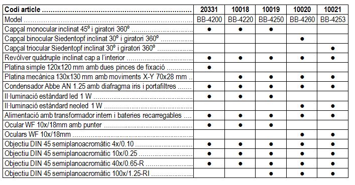 - Objectius semiplanoacromàtics 4x/0.13, 10x/0.25 i 40x/0.65-R